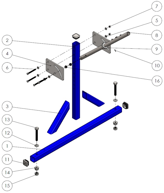 Step 4: Mount the square tube beams (9) to the frame using the bolts (10), nuts (11) and washers (12). Use 3/8’’ washers as spacers between the beams and angle iron (3), see montage plan. Proceed to the last step, mounting the square tube end caps (13).
